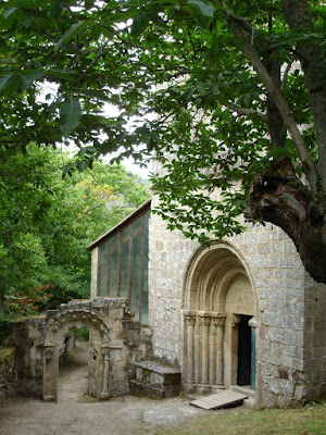 Existem determinados rituais que vamos descobrindo ao longo das nossas vidas, correspondentes a outras eras e a outros tempos. Numa altura em que o próprio Tempo parece correr vertiginosamente para um pós-modernismo “elevado a um extremo inefável”, em que o presente de hoje amanhã já é obsoleto, ainda encontramos reminiscências disfarçadas de mitos e de lendas, devido às suas estruturas não encaixarem com o pensamento contemporâneo. Obviamente, surgem revivalismos religiosos, estéticos e culturais a toda a hora, apenas como modas que voltam e que vão, ao sabor da vertigem consumista deste século. Finais dos tempos, dizem uns?! Cá para mim, é mais uma repetição dos tempos. Numa das nossas incursões pela bela Galiza, encontramos no Mosteiro de Santa Cristina de Ribas de Sil (Ourense) a árvore sagrada que ali serve de altar de devoção e de pedidos de inúmeros crentes. Esta árvore tem já um culto antigo, sendo bastante conhecida na região. Herança, talvez, dos habitantes celtas e dos seus sacerdotes, que adoravam as árvores e a natureza, restando como prova de uma não total conversão dos locais à cristianização. Para além disso, existe a crença de que quem entrar nos seus cascos e cavernas ocas acabará por ser curado dos males de que se padece. Por entre as ruínas do mosteiro beneditino (século IX) e igreja românica (século XII), e por entre a enorme extensão de centenários castanheiros, surge este outro castanheiro, com a forma bizarra e grotesca, parecendo encerrar uma caverna dentro de si mesmo, que podemos vislumbrar na parte detrás. Os seus ramos, vestidos ou despidos conforme a época, estão pejados de fotografias. Também de terços, colares, pulseiras, moedas coladas, cigarros, doces, imagens de santos e muitos papéis com pedidos escritos em diversas nacionalidades. Desde aquela estudante que queria ter boas notas num exame de faculdade a alguém que queria deixar de fumar; ou outra pessoa que tinha uma doença incurável e que estava em desespero de causa. O certo é que o santo em destaque na árvore (penso que fosse São Benito) tem muito para onde se virar. E como diz o velho ditado:”Em Roma, sê romano!”…nós não fugimos à regra e deixámos os nossos pedidos. Ali ficou ele, resguardado por algo que dizem que não é assim tão biodegradável. Neste caso, dá jeito. O Luís disse-nos que quer lá voltar daqui a vinte anos para ver se o papel ainda lá se encontra...e se os pedidos que fizemos a este Santo deram resultado! E o que é que se pode querer mais?!
